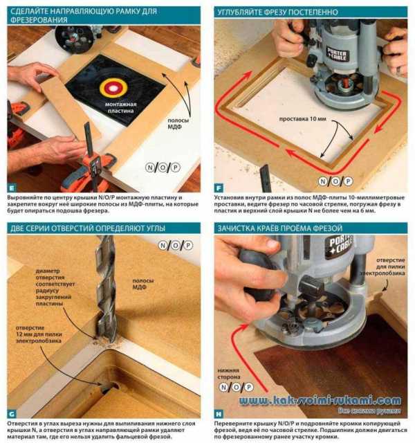 5. Копирующей фрезой с нижним подшипником выровняйте края выпиленного проёма, ведя фрезер по часовой стрелке (фото Н).
