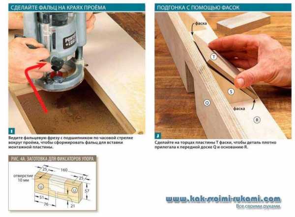 Краткий совет! Для выпиливания фальцев не делайте вырез в продольном упоре, а прикрепите к нему двухсторонним скотчем накладку из обрезка доски.