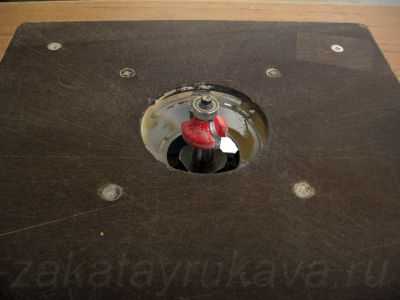 После присадки монтажной пластины, необходимо фрезером с пазовой прямой фрезой большой длины (больше толщины столешницы) выполнить сквозное фрезерование отверстия в столешнице по форме подошвы фрезера. Эта операция особой точности не требует. Возможно, придется выполнить дополнительную выборку материала снизу столешницы под различные, мешающие нормальной установке, конструкционные элементы фрезера, например, для кожуха пылеулавливателя.