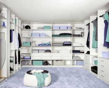 - П-образные. Это целая гардеробная комната, куда можно вместить все, что угодно. Здесь вы можете разместить и закрытые тумбы или ящики, и стеллажи, и отдельно установленные секции. Площадь помещения можно заполнить по-разному, используя дизайнерские приемы. Идеальная комната для такой гардеробной должна быть удлиненная и немного зауженная. Здесь можно оборудовать антресоли, используя широкие верхние полки или ящики, где можно хранить редко используемые вещи, дорожные сумки и спортивный инвентарь.