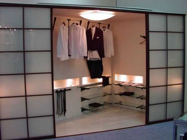 На пол сооруженной комнаты рекомендуется уложить плитку, застелить ее ковролином либо недорогим линолеумом. Двери в самодельные гардеробы обычно ставятся самые простые. Оптимальный вариант – раздвижные конструкции. Они займут минимум свободного пространства и будут удобны в применении. Освещение комнаты советуем организовать при помощи точечного светильника. Для небольшого помещения достаточно одного такого прибора. Наполнение самостоятельно сделанного помещения для хранения вещей выполняйте любыми подходящими вам приспособлениями, о которых мы говорили выше.