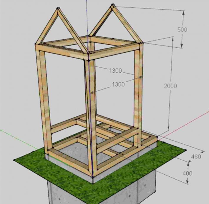 Строительство «Шалаша» начинается с установки фундамента, затем нижней части каркаса 1 на 1метр и постройки выгребной ямы. Основание нужно обработать антисептиком.