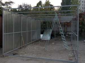 Здесь Вы видите особенности постройки металлического гаражного бокса. Проблемы здесь в основном кроются в качестве сварки – если углы и соединения будут плохо проварены, то конструкция через 3-4 года потеряет свою устойчивость. При этом форма конструкции стандартная, что облегчает процесс соединения всех элементов. Обратите внимание на кровлю – при создании 2-ух скатных конструкций необходимо монтировать дополнительные ребра жесткости и правильно рассчитать угол.