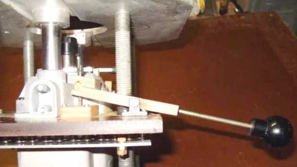 - Рычажный механизм. Позволяет более оперативно менять высоту инструмента, даже во время работы. Расширяет возможности станка: в некотором смысле фрезер становится трехмерным.