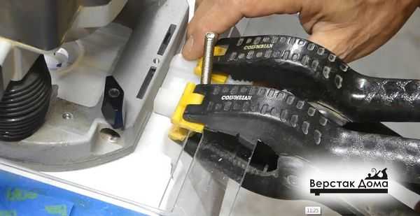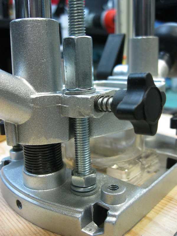 - Фиксирующая винтовая тяга. С помощью резьбовой шпильки, устанавливается необходимая глубина проникновения фрезы. При необходимости ее можно менять.