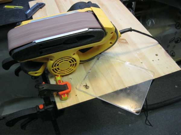 Из оргстекла отрезают две полосы размером 500х50 мм для изготовления направляющих фрезерного стола. Грани направляющих шлифуют для снижения трения.