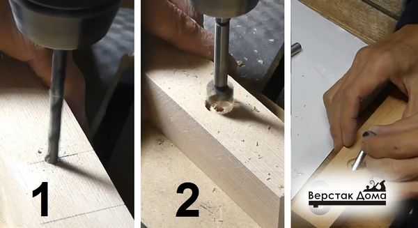- Фрезой выбирают потай для шляпок мебельных болтов.