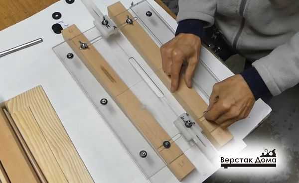 - Заготовку устанавливают снизу, охватывают с двух сторон прижимными брусками и зажимают. При помощи разметки на оргстекле платформы и нанесенных меток на бруске, конструкцию ориентируют таким образом, чтобы центр бруска находился по центру платформы. Зажимают барашки прижимных брусков. После этого конструкцию с заготовкой зажимают в столярных тисках.