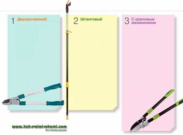 Ручные сучкорезы, в свою очередь, по способу приведения в действие можно разделить на двухрычажные и штанговые (высотные), а в зависимости от типа режущего механизма — на обводные, с наковальней и с храповым механизмом.