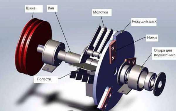 - Собираются элементы рубильного блока. На вал одеваются подшипники, маховик (диск с ножами), молотки.