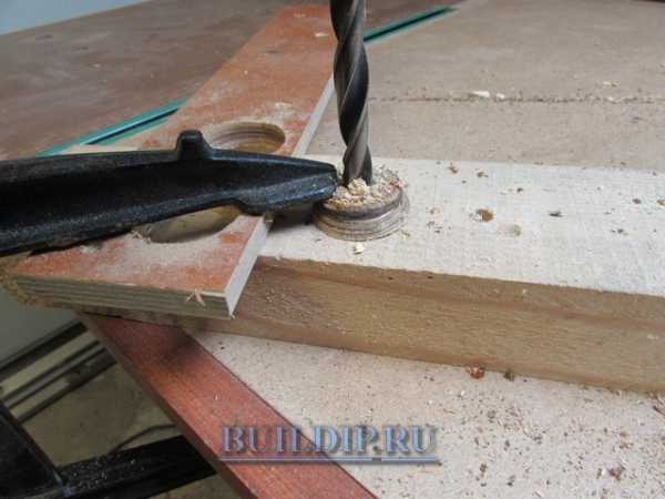 - В горизонтальном бруске и вертикальной опоре для длинного крепежного болта просверливается сквозное отверстие. Со стороны паза на болт накручивается гайка с шайбой.