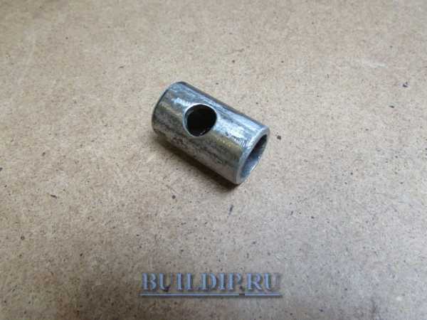 Возьмите полудюймовую трубку, отмерьте на ней отрезок длиной в толщину фанерной скобы. Высверлите по центру отверстие для болта и обрежьте втулку по размеру. Сточите напильником металлические заусенцы и зачистите наждачной шкуркой поверхности.