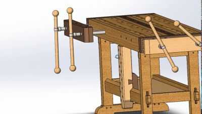 На столе располагают фронтальные и задние зажимы посредством винтов, без них стол не является столярным верстаком и не может выполнить основную задачу, поэтому эти приспособления сооружают в первую очередь. С помощью заднего крепления фиксируют дерево во время строгания. Зажимные губки приспособления передвигаются вдоль фронтальной кромки, и с помощью винтов хода закрепляют деталь.