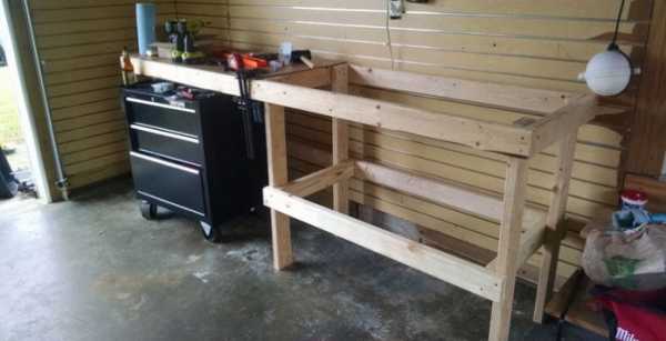 Подверстачье собирается из нескольких секций с применением сырья, использованного при производстве крышки. Это практичная модификация для перестановок и переездов. Постройка рабочего столярного стола начинается с основания.