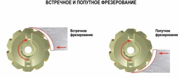 - Попутная фрезеровка, при которой и заготовка, и фреза перемещаются в одном направлении.