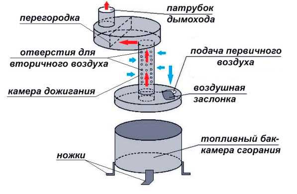 После закипания топлива (не горения, а лишь закипания) образующиеся летучие вещества попадают через трубу в камеру вторую. Одновременно при переходе через нее газы будут насыщаться кислородом, способствующем горению. Для этих целей в трубе предусматривается перфорация. Воспламеняться газы начинают уже в трубе, а догорают во второй камере. Причем подача должна осуществляться небольшими дозами.
