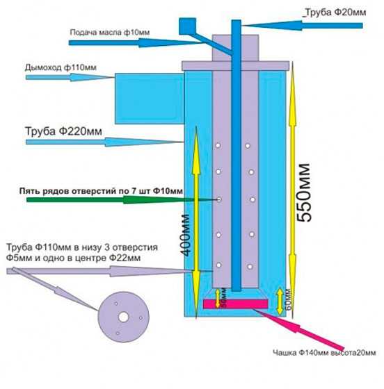 Масло перед заливом в бак необходимо отфильтровать! Нельзя использовать другие горючие жидкости! Бензин используют только в небольших количествах для розжига холодной печи!На отработке: эскизы и чертежи