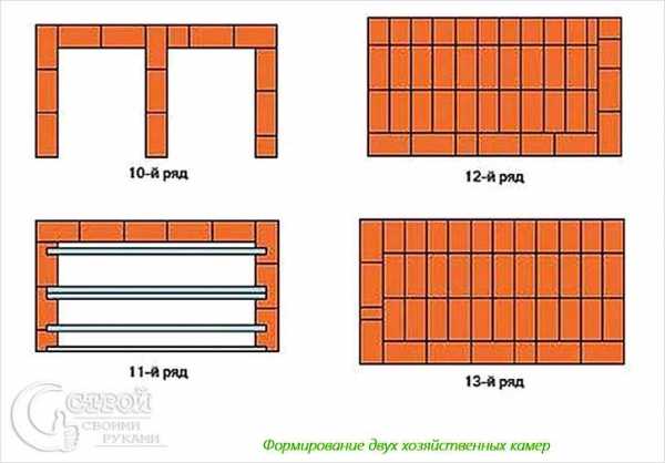 Формирование камерДалее кладка выполняется по схеме. В 12 ряду используются пиленные вдоль кирпича. 12 и 13 ряды имеют больший размер, нежели нижние, благодаря чему образуется некий декоративный пояс.
