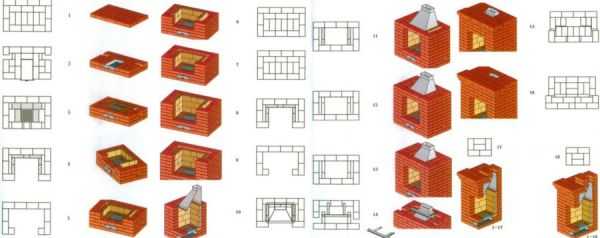 Схема кладки барбекюНа высохший фундамент укладывается гидроизоляционный слой. После чего можно приступать к кладке кирпича. Если строительство барбекю ведется в беседке, то первый ряд печи должен быть выложен на уровне пола. Если фундамент под барбекю получился ниже уровня пола в беседке, то выложите дополнительный ряд кирпичей. После чего кладка выполняется строго по приведенной схеме.
