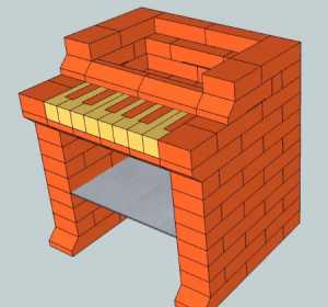 Продолжить следующие 3-4 ряда в половину кирпича, выдерживая изначальную толщину. А с десятого ряда необходимо повторить порядовку печи барбекю, с расчетом на повторную поперечную кладку для решеток.