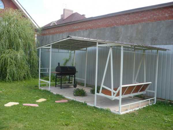 При этом конструкцию советуем крепить на металлические углы. Это самый лучший вариант, так как он облегчает его сборку. Полотном для навеса чаще всего выступает профнастил. Он огнеупорный, никак не реагирует на перепады температур и отличается невысоким весом, что важно для облегченной конструкции.