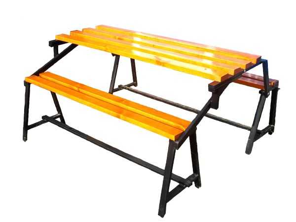 Конструкция состоит из 3-х частей. Часть с неподвижными сиденьями, часть со столом и часть с подвижными сиденьями.
