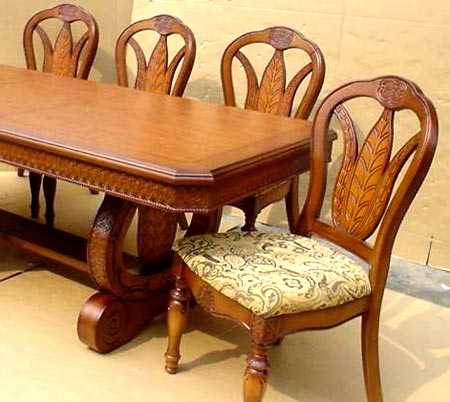 Самый простой вариант для начинающих пропильная резьба, которая осуществляется электролобзиком. Также резной стул можно украсить несложным геометрическим узором. Для изготовления более сложных фигурных деталей, например фигурных ножек, потребуются специальные станки. Самые простые точеные элементы изготавливаются на токарных станках. Декоративные резные выемки создаются с помощью фрезерного станка.