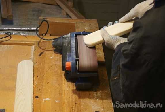 Неровности, оставшиеся от циркулярки, ручная работа, все-таки, убираю с помощью электрорубанка. Поверхность дерева остается ровной и гладкой. Можно отказаться от дальнейшей шлифовки. Тем же рубанком снимаю прямые углы вдоль брусков, делаю фаски. Для удобной работы использую деревянные подкладки с ромбовидным вырезом. Эти несложныеприспособления надежно удерживают брусок «на ребре».