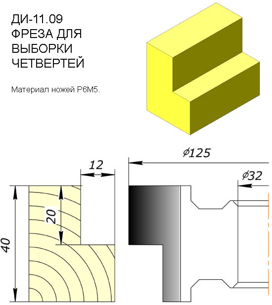 Если необходимо снять четверть с заготовки (если она деревянная), необходимо применять специальную фрезу. Зачастую они специально комплектуются особым подшипником или упорной втулкой, имеющей подшипник. Зачастую их изготавливают из среднелегированной стали, что обеспечивает долговечность, прочность и износостойкость. Наличие твердосплавной напайки существенно повышает качество реза, его точность и аккуратность.