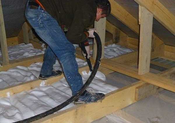 Технология утепления с помощью пеноизола проста: настилаем пароизолятор и заливаем пространство между чердачными балками слоем утеплителя на толщину 20-30 сантиметров. Сверху можно дополнительно уложить слой рубероида и настелить дощатый пол.