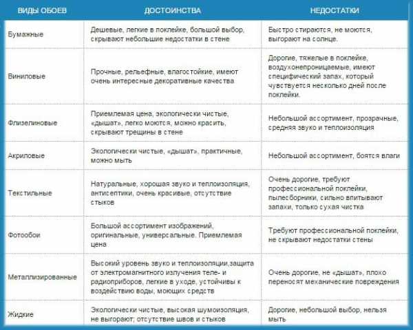 Итак, обои. Материал, используемый вот уже несколько веков, известен абсолютно всем. Впрочем, далеко не каждый догадывается обо всех его преимуществах и недостатках. Информация, приведённая ниже и структурированная для удобства читателей в таблицу, поможет восполнить пробелы и, может быть, поменять свои взгляды.
