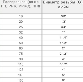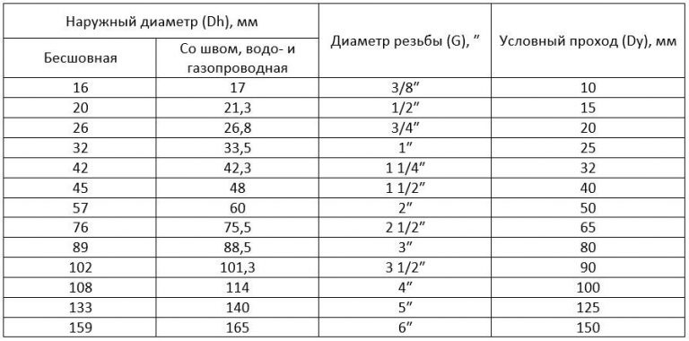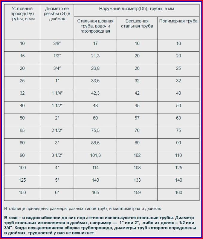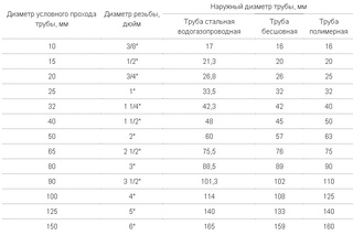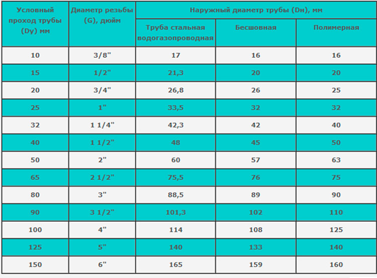 Таблица соответствия диаметра условного прохода, резьбы и наружных диаметров трубопровода в дюймах и мм.