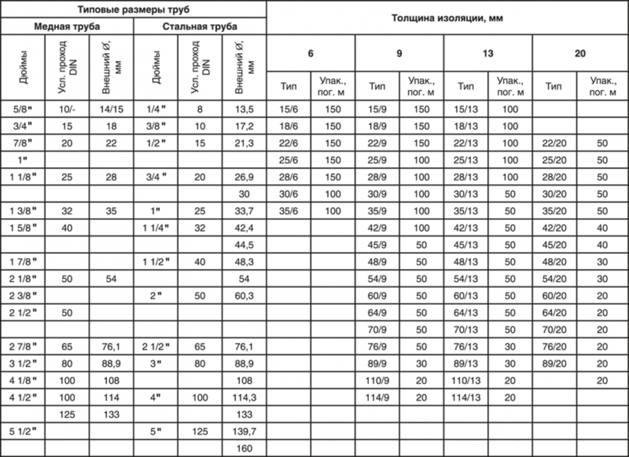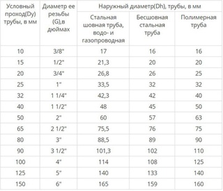 Таблица соответствия условного прохода дюймам