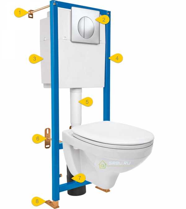 1 — Шпилька для крепления рамы к стене; 2 — Кнопка смыва; 3 — Смывной бачок; 4 — Рама; 5 — Сливная труба; 6 — Шпилька для крепления унитаза; 7 — Сливной отвод; 8 — Крепление к полу.