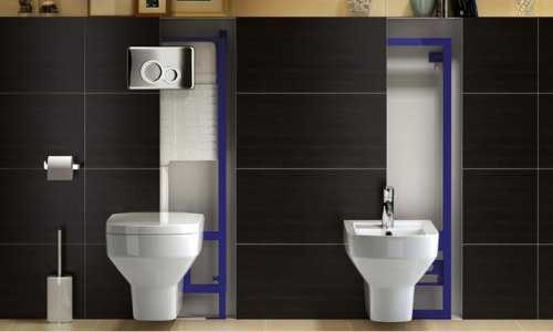 В основе такой инсталляции лежит надежная рама. Ее установка осуществляется при помощи крепежных элементов в 4 точках (2 на стене и 2 на полу). При этом габариты рамной инсталляции могут быть различными. Поэтому подобрать подходящую для своего санузла систему будет абсолютно несложно. Кроме того, можно найти изделие, на которое можно будет установить сразу 2 сантехнических прибора, например унитаз и биде.