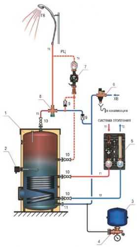 Обозначения: 1 — бак ГВС косвенного нагрева с теплообменником; 2 — встроенный ТЭН для электронагрева; 3 — расширительный бачок для холодной воды; 4 — отсечной вентиль для быстрого монтажа / демонтажа расширительного бачка; 5 — насосный блок для подачи воды от системы отопления; 6 — предохранительный и обратный клапаны системы безопасности на линии подачи холодной воды; 7 — рециркуляционный насос горячей воды с арматурой; 8 — термостатический смеситель горячей и холодной воды для защиты от ошпаривания; 9 — обратный клапан; 10 — отсечной шаровый кран и быстроразъемное соединение (11) для быстрого отключения бака ГВС.