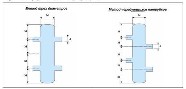 С диаметром гидроразделителя для отопления определились, но надо знать еще и длину. Ее подбирают в зависимости от диаметра подключаемых патрубков. Есть два вида гидрострелок для отопления — с отводами, расположенными один напротив другого и с чередующимися патрубками (располагаются со сдвигом один относительно другого).