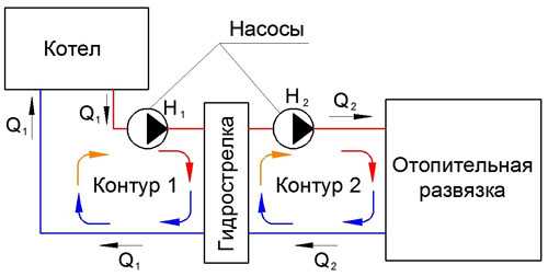 - Контуров три и больше, все очень разной мощности (разный объем контура, требуется разная температура). В таком случае, даже при идеально точном подборе насосов и расчете параметров, есть возможность нестабильной работы системы. Например, часто встречается ситуация, когда при включении насоса теплых полов, радиаторы стынут. Вот в этом случае нужна гидроразвязка насосов и потому ставится гидравлическая стрелка.