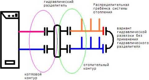 Монтаж гидравлического разделителя в основном производят на линиях подачи и обратки перед распределительными гребёнками системы отопления непосредственно после котла /-ов/. Гидравлическую развязку можно осуществить и без применения гидравлического разделителя. Например, применить вариант указанный на рисунке. В таком варианте трубопроводы распределительных гребёнок подачи и обратки образуют котловой контур. Окончательная конфигурация гидравлической развязки зависит от особенностей и конфигурации системы отопления в каждом конкретном случае.