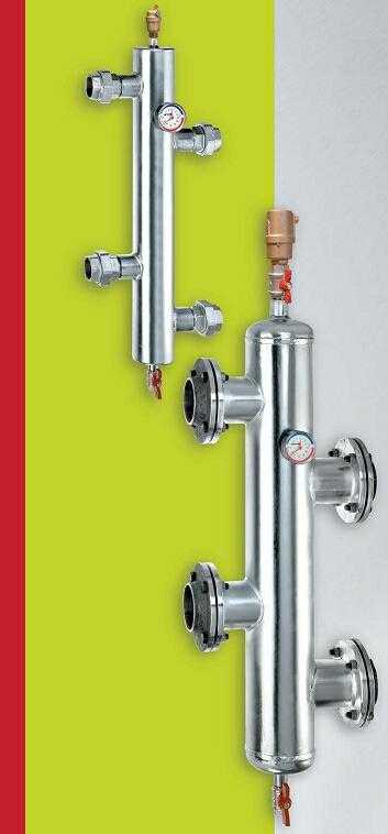Гидравлические разделители SPLITFLO предназначены для использования в тех гидравлических системах, где целесообразно разделить контур теплогенератора и распределительный контур. Гидравлический разделитель (стрелка) обеспечивает постоянный расход в обоих контурах, каждый из которых становится независимым и создает зоны с уменьшенной потерей напора. Таким образом, мы можем иметь постоянный расход в контуре теплогенератора и переменный расход в распределительном контуре. Кроме этого, в гидроразделитель встроены воздухоотводчик и термоманометр. Низкая потеря напора в разделителе способствует оседанию шлама, который затем можно легко удалить из нижней части разделителя с помощью специально предусмотренного для этого шарового крана. Материал разделителя — чистая сталь для электросварки по стандарту UNI 7091/72. Маркировка труб: DIN 2458 ST37.0 WB WI TCB DIN 2458 ST37.0 WA TCB