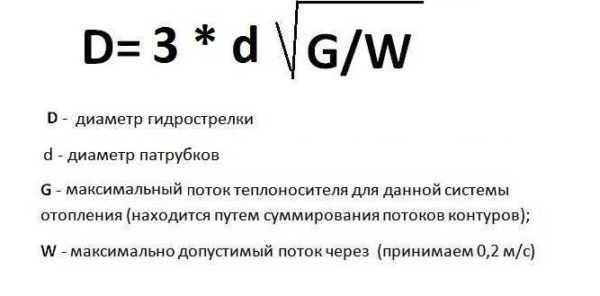 Формула расчета диаметра гидравлического разделителя для системы отопления в зависимости от максимального потока теплоносителя