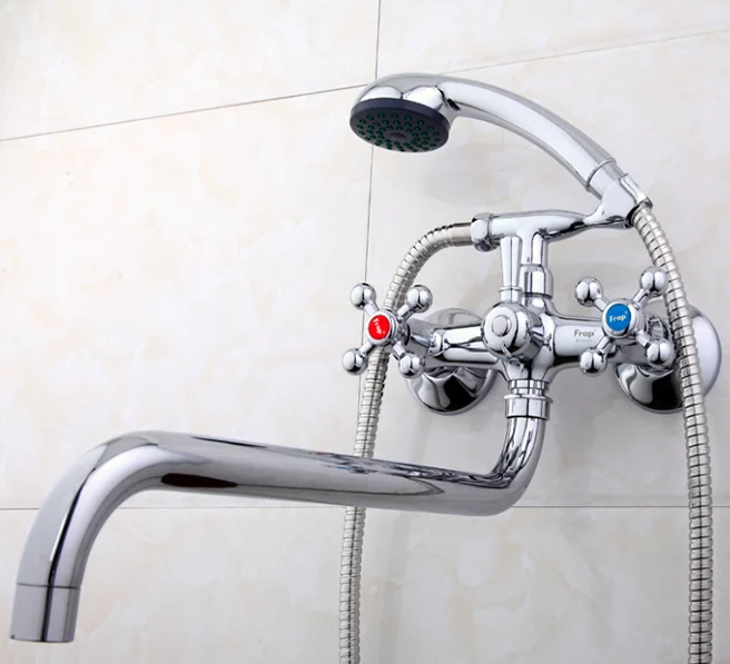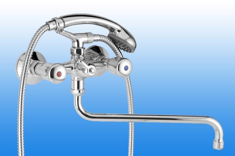 - Настенные применяют обычно в ванной. Чаще всего они предполагают работу как с изливом, так и с лейкой благодаря соответствующему переключателю.