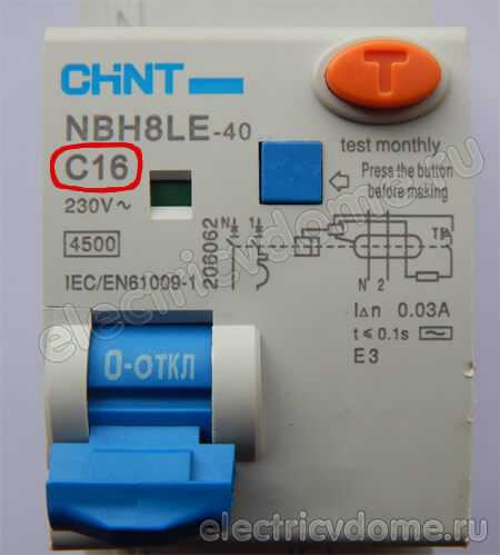- Сила тока. На лицевой части корпуса самые большие цифры показывают номинальный ток. Если перед этими цифрами нет букв, то перед вами УЗО. Буквы «А», «В», «С» и «D» перед силой тока указывают на тип теплового и электромагнитного расцепителя, значит перед вами дифавтомат.