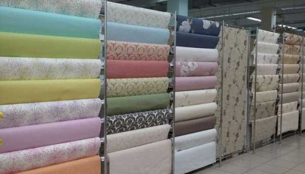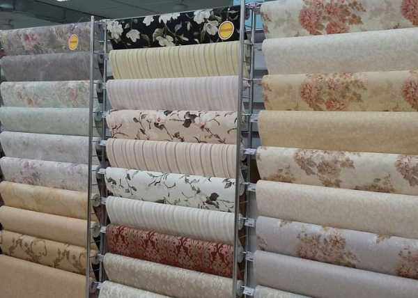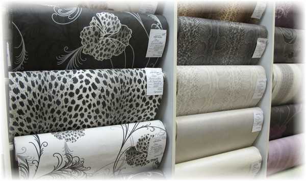 Палитра виниловых обоев на флизелиновой основе, представленная магазинной витриной