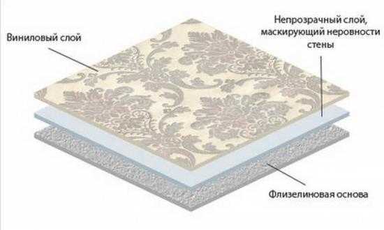 Двухслойные обои. Нижний слой обоев называется основой. Существуют виниловые обои на флизелиновой основе, а также на бумажной. Основа покрывается плотным, твердым, вспененным винилом или шелкографией. Достоинства виниловых обоев заключаются в их прочности, большом сроке службы (не менее 10 лет), простом уходе и широком спектре применения. Из минусов: искусственное происхождение материала. Винил выделяет вредные летучие вещества, хотя и в малых дозах. Также недостатком виниловых обоев можно считать плохую воздухопроницаемость. Под обоями может образоваться плесень и грибок.