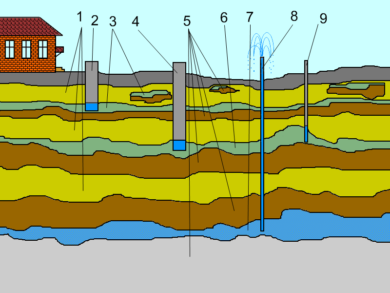 Артезианская скважина — это скважина, которая пробурена до артезианского водоносного горизонта, который расположен между двумя мощными региональными водоупорами, захватывает обширные территории Московской, Тверской и Владимирских областей. Водоупорами могут быть – глины, суглинки и тому подобные породы.