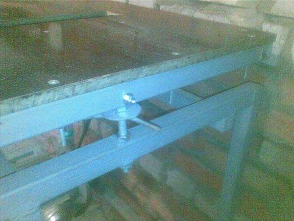Для работы фуганком, чтобы реализовать подъем стола относительно вала, решил прикрепить одну часть стола на петли к раме, а другую часть зафиксировал на болт, к которому приделаны ручки для быстрой регулировки глубины спила древесины фуганком.