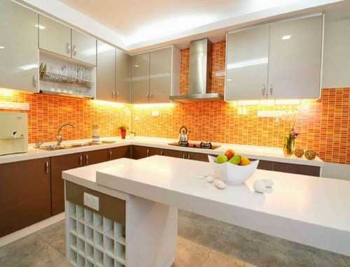 Сочетание абрикосового цвета в интерьере кухни с белым