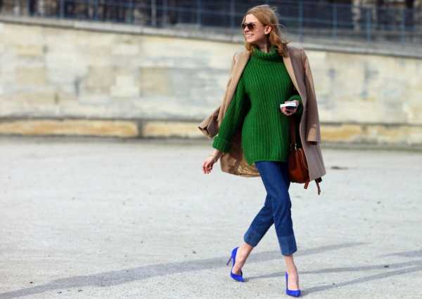 К примеру, синие брюки и зеленый пуловер. Вечернее платье в сочной зелени можно дополнить брошью, сережками ярко-синего. Зеленые жакеты, пальто могут содержать синие отделочные элементы (обтачка, клапан, воротник, пуговицы). О макияже для синих глаз, который может быть и изумрудным, можно почитать здесь.
