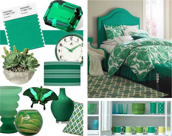 Изумрудный — модный цвет 2013 года. Ослепительный тон, который стал популярен в одежде и интерьере. Сочетание изумрудного: 10 палитр. Фото.